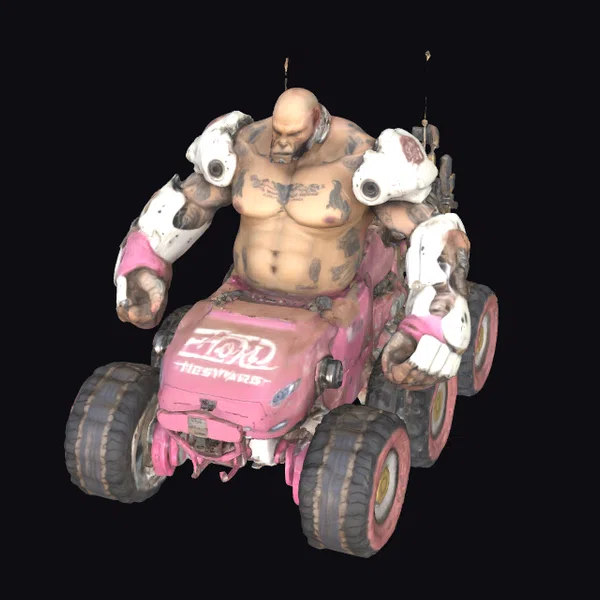 Perched atop a rugged pink truck, this imposing figure exudes an aura of intimidation. His bald head and torso are covered in dark tattoos, complemented by bulky white and pink armor on his arms. The truck itself appears to be a hodgepodge of parts, with oversized tires and a heavily modified body. The vehicle’s hood features eye-catching white graffiti. This stylized model would be perfect for adding a unique character to games, animations, or VR/AR experiences, particularly in cyberpunk or sci-fi settings.