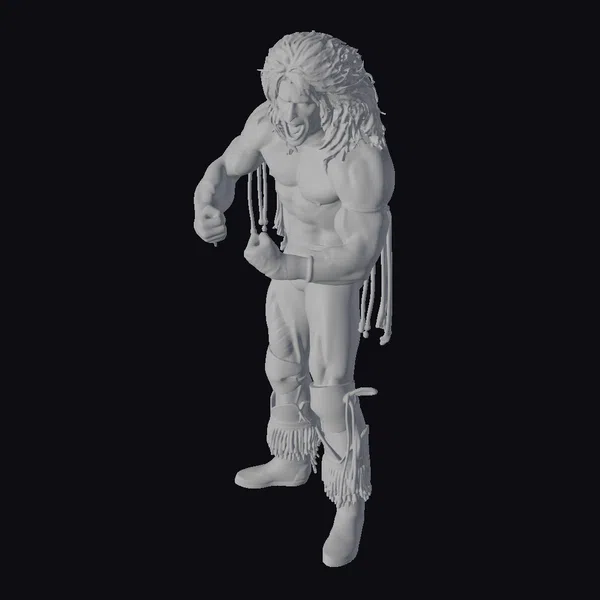 Standing in a powerful stance, this muscular man showcases a detailed physique, accentuated by a furry texture that covers his head, reminiscent of a wild beast. His body is painted with a sheen of sweat, highlighting his intense physical exertion. The neon-colored attire, including a brief loincloth, wristbands, and knee wraps, contrasts sharply with his earthy fur tones. Long strands of neon-colored ribbons flow from his arms and waist, adding a dynamic movement to his appearance. His white boots, fringed and decorated, complete the eclectic look. This model is perfect for projects requiring a unique character with a blend of human and animal traits, suitable for animation, game development, or virtual reality experiences.