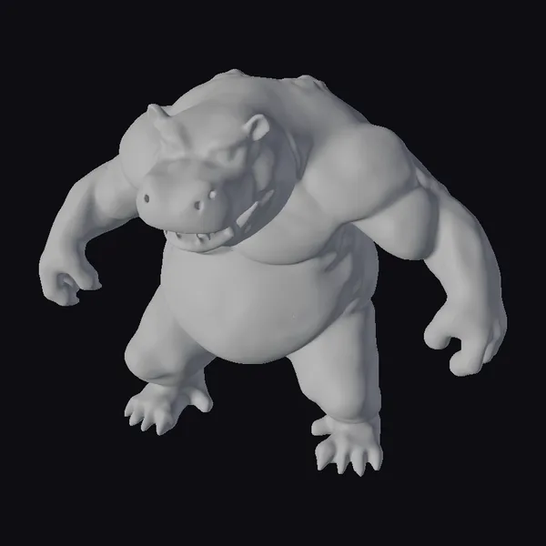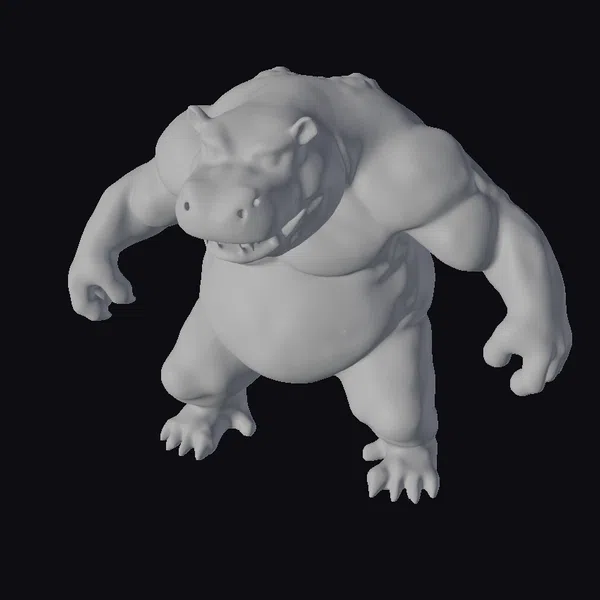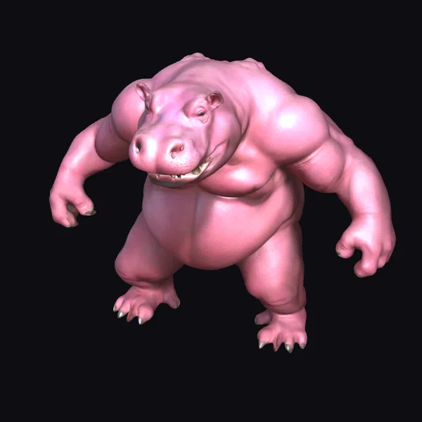 Standing tall with a powerful build, this muscular pink hippopotamus commands attention. Its anthropomorphic design features a humanoid stance, complete with sharp claws and a menacing grin. The model’s pink coloration gives it a unique, fantastical appearance. With its robust physique and intimidating demeanor, this character is ideal for use in animations, games, or designs that require a strong, fantastical element. The model’s stylized features make it versatile for various creative projects.