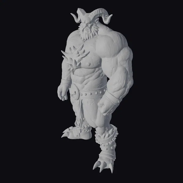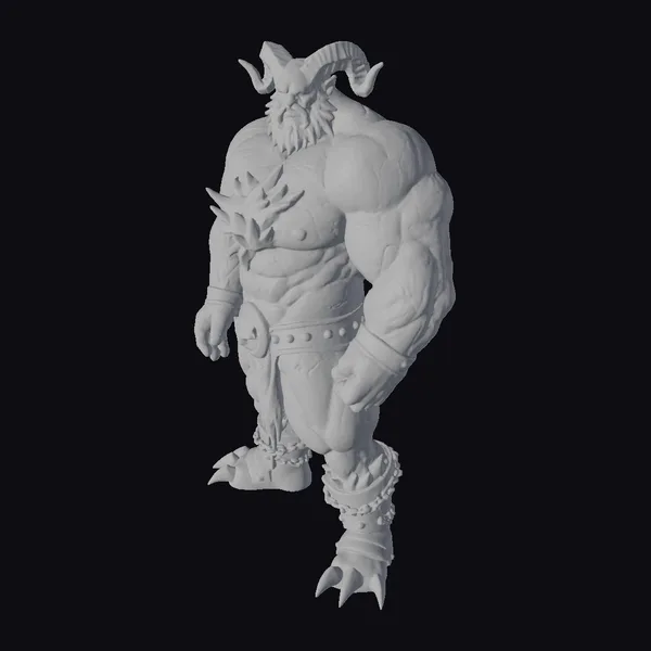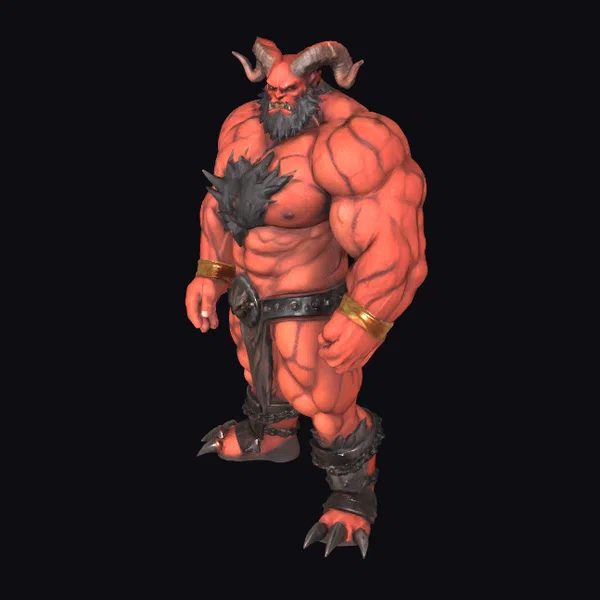 Standing tall with a muscular build, this red demon model showcases intricate details such as textured skin, a flowing black beard, and sharp, curved horns that add to its fearsome appearance. The character’s attire consists of a black belt, gold bracelets, and armored leg guards that complement its clawed feet. The model is posed dynamically, highlighting its physical prowess. Ideal for use in games, animations, or 3D printing projects, this model can bring a touch of fantasy and intensity to various creative endeavors.