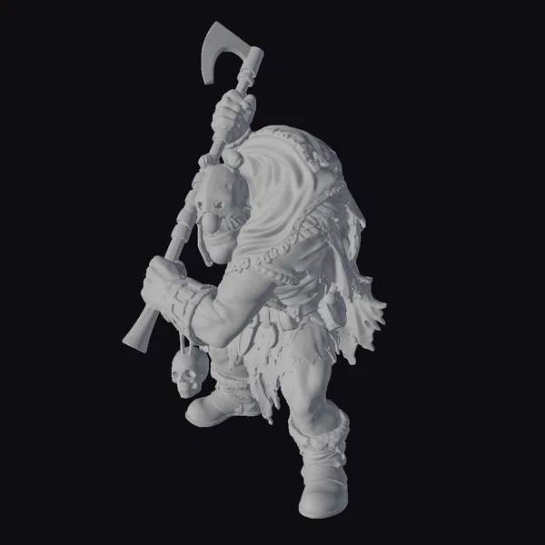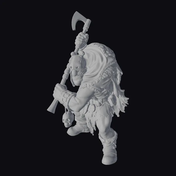 This imposing figure stands ready for battle, his muscular physique evident beneath his worn and tattered armor. The warrior’s face is obscured by a dark hood, adding to his intimidating presence. He grasps a large battle-axe in one hand, its blade gleaming with a deadly edge. A human skull hangs from his belt, a grim trophy that hints at his brutal prowess. The model’s detailed textures and realistic proportions make it perfect for use in games, animation, or 3D printing. Its dynamic pose and menacing appearance are sure to add a touch of dark fantasy to any project.