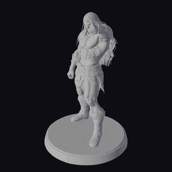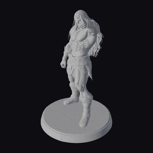 Standing proudly on a sleek black base, this fantastical warrior figurine showcases intricate details, from the defined muscles of his arms and torso to the flowing strands of his dark hair. His attire, consisting of a fur-trimmed loincloth, a wide brown belt with a silver buckle, and fur-trimmed boots with red and grey accents, speaks to a bygone era of heroes and legends. The pose, with one hand raised to his chin and the other at his side, suggests a moment of contemplation or fierce determination. This model is perfect for use in games, 3D printing, virtual reality experiences, animations, or as a detailed design reference.