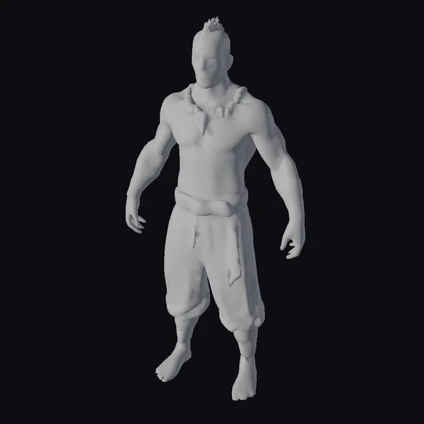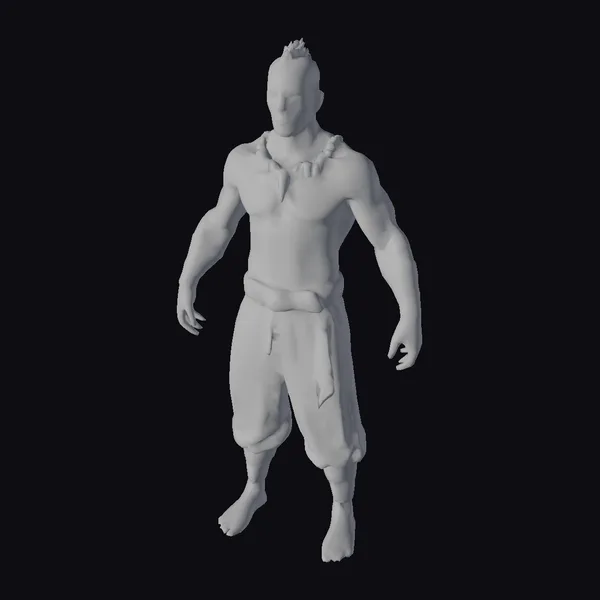 This imposing figure showcases a muscular build, accentuated by detailed tattoos on his arms, chest, and shoulders. His facial features are defined, with a strong jawline and intense expression. The warrior’s outfit consists of a brown loincloth and matching armbands, adding to his primal appearance. The model’s pose exudes confidence and power, making it an excellent choice for projects requiring a robust, ancient warrior character. Its realistic style ensures a lifelike representation, suitable for various applications including games, animation, and 3D printing.