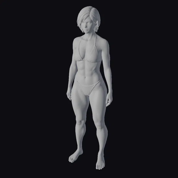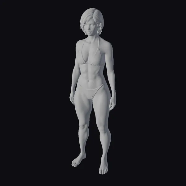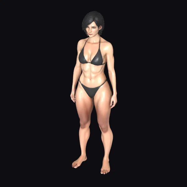 This 3D model presents a muscular woman with a commanding presence, captured in a straightforward pose that accentuates her physical prowess. Her black bikini highlights her toned body, complete with defined abs and powerful legs, suggesting a lifestyle of fitness and strength. The short, dark hair adds to her edgy demeanor, while her expression conveys a sense of quiet confidence. The model’s realistic appearance makes her suitable for projects requiring a strong, adult character, such as video games, animation, or virtual reality experiences. The detailed textures and lifelike proportions ensure that she can seamlessly integrate into various digital environments.