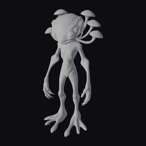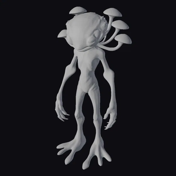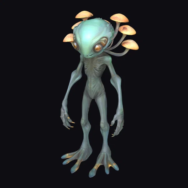 Standing tall with an air of mystique, this alien humanoid hybrid boasts a slender yet imposing physique. Its green, almost translucent skin glistens under an unseen light source, while mushrooms with golden caps sprout from its back, suggesting a symbiotic or parasitic relationship. The creature’s elongated limbs end in sharp, claw-like fingers and toes, hinting at a predatory or defensive capability. Its large, golden eyes seem to hold a deep wisdom or ancient knowledge, inviting the viewer to ponder its origins and purpose. This model is perfect for projects requiring a unique, sci-fi character, such as animations, games, or conceptual art. Its detailed features and intriguing appearance make it an excellent choice for creators looking to add an extraterrestrial element to their work.