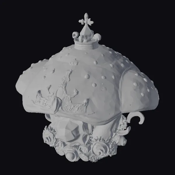 Perched atop a sturdy stem, the Mushroom Kingdom Royal Emblem’s cap is a masterpiece of dieselpunk design, with a mesmerizing iridescent sheen that shimmers in shades of gold, orange, and blue. A delicate crown, embellished with red gemstones, crowns the emblem, while a lavish arrangement of colorful gems and metallic accents adorns the stem. The overall effect is one of opulence and sophistication, perfect for adding a touch of fantasy flair to any project. Whether you’re creating a game, animation, or architectural visualization, this emblem is sure to captivate audiences with its unique blend of science fiction and fantasy elements.