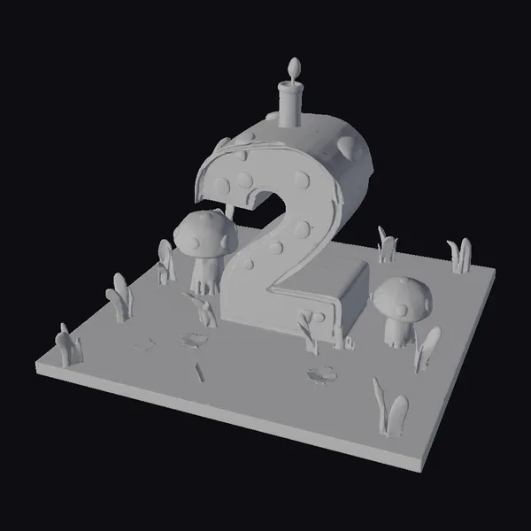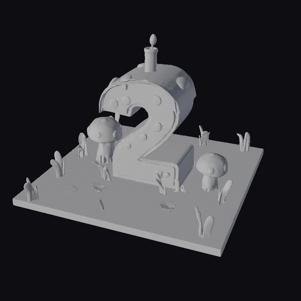Deep in a fantastical forest, a delightful birthday scene unfolds. The centerpiece is a stylized number 2 cake, designed to resemble a mushroom with a bright red cap dotted with white spots. A small blue and white striped candle flickers atop the cake, casting a warm glow. The cake itself is a vibrant yellow, with a smooth, rounded surface. The scene is set on a green base, complete with tufts of grass and scattered red flowers, adding to the enchanting atmosphere. Three red-capped mushrooms with white spots surround the cake, creating a sense of whimsy and wonder. This charming setup is perfect for various creative projects, such as games, animations, or 3D printing. The model’s intricate details and colorful design make it an eye-catching addition to any scene.