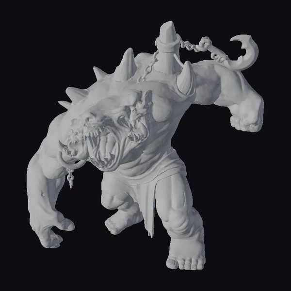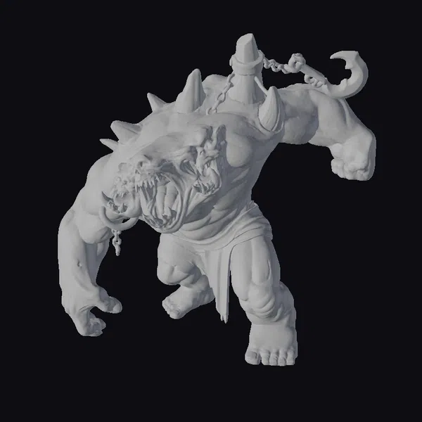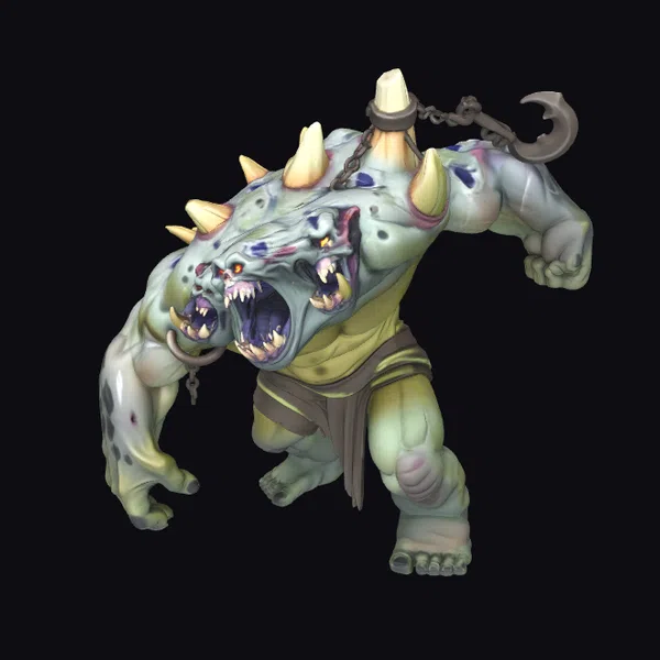 Standing menacingly, this creature boasts two large heads, each equipped with sharp teeth and powerful jaws, set against a backdrop of a muscular, green body adorned with spikes. A chain and hook attachment add to its fearsome appearance. The creature’s aggressive stance and vivid details make it a compelling asset for projects requiring a touch of horror or fantasy. Ideal for use in games, animations, or 3D printing, this model brings a unique blend of terror and fantasy to any scene.