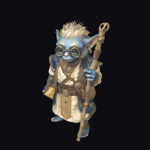 This diminutive, blue-skinned goblin stands poised on tiptoes, radiating an aura of mystique. Its spiky, off-white hair adds a touch of whimsy, while round glasses perch on the end of its nose, lending an air of learned wisdom. Adorned in a flowing white robe with intricate blue and gold accents, the goblin grasps a staff that appears almost as long as its body, topped with a curious, bone-like structure. The model’s textures are rich and detailed, with subtle variations in the goblin’s blue skin tone and the staff’s worn leather wrapping. The glasses, with their intricate metal frames, add a delightful touch of realism. The goblin’s pose, staff in hand, suggests a moment of contemplation or perhaps the anticipation of casting a spell. This model would be a fantastic addition to any fantasy game, animation, or VR/AR experience, offering a unique character that can drive storytelling and immersion.