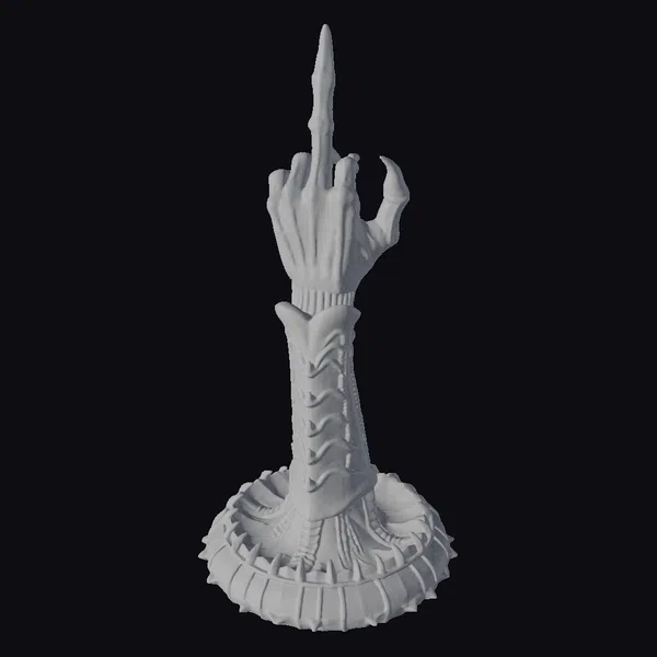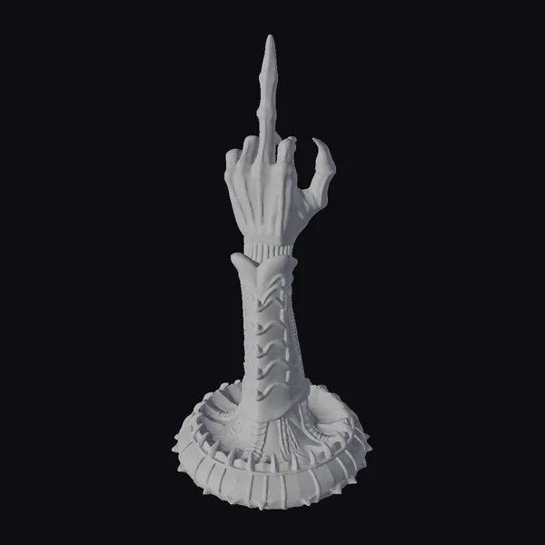 In a pose that commands attention, this mystic dark hand gesture stands tall on a spiked base, its glossy black surface reflecting light and adding depth to its already formidable presence. The hand itself is raised with the index finger pointing skyward, while the other fingers are curled in a gesture that speaks of ancient powers and mystic incantations. The texture is rich with spikes and ridges, both on the hand and the base, suggesting a creature or being of dark legend. This model is perfect for adding a touch of the fantastical to games, animations, or virtual reality experiences. Its detailed design and high-quality appearance make it an asset for designers looking to create immersive and engaging narratives.