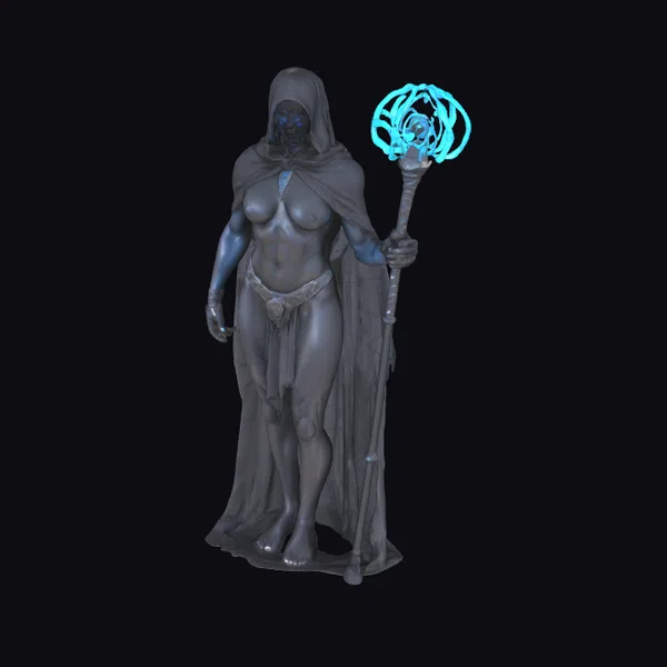 This captivating figure boasts a chiseled, athletic build, accentuated by her toned abs and powerful limbs. Her blue skin seems to glow with an ethereal light, as if infused with magic. The dark cape flows around her, partially obscuring her face, adding to her enigmatic presence. In one hand, she holds a staff that shines with a vibrant blue aura, suggesting her mastery over mystical forces. The intricate details, from the texture of her skin to the folds of her cape, invite the viewer into a world of fantasy and wonder. Ideal for projects requiring a strong, mystical female presence, such as games, animations, or virtual reality experiences.