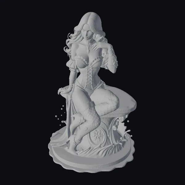 The Mystic Female Figure sits regally on a detailed pedestal, her pose suggesting a blend of vulnerability and power. Her facial features are finely tuned, with a focus on expressive eyes and lips that seem to whisper secrets. The textures of her outfit are meticulously crafted, from the smoothness of her skin to the intricate patterns on her corset and the delicate lace trim. The pedestal itself is adorned with mystical symbols, adding to the enigmatic atmosphere. This model is perfect for use in games, 3D printing, VR/AR experiences, animation, and design projects where a touch of mysticism and allure is desired.