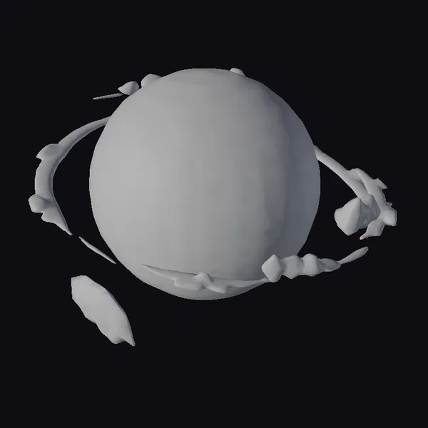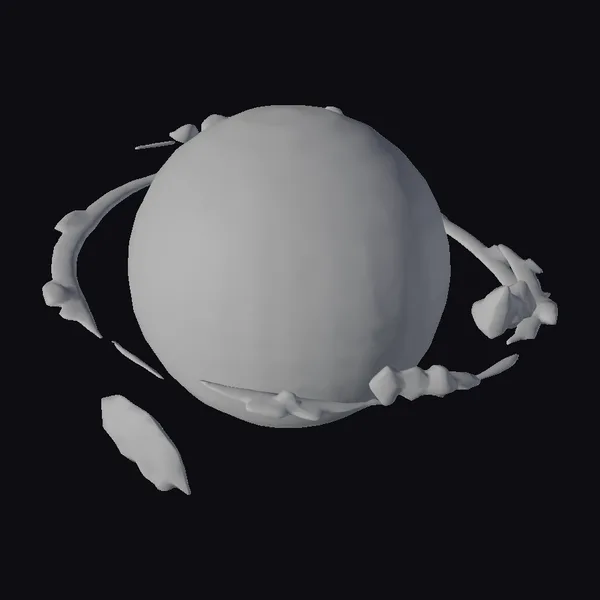 Suspended in the vast expanse of space, a mystic planet dominates the scene with its dark, icy surface and breathtaking ring system. The planet’s surface appears to be a mix of dark blues and greys, with hints of brown and green, suggesting a world both alien and familiar. The ring system, comprising numerous small, irregularly shaped objects, adds a sense of dynamic movement to the scene. As the light catches the planet’s surface, a bright star shines in the background, casting a sense of wonder and mystery. This 3D model is perfect for use in games, animations, or virtual reality experiences, offering a unique and captivating visual element. Designers and artists can use this model to create immersive and engaging stories that transport viewers to the farthest reaches of the galaxy.