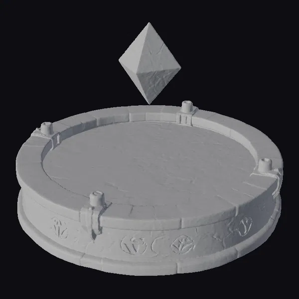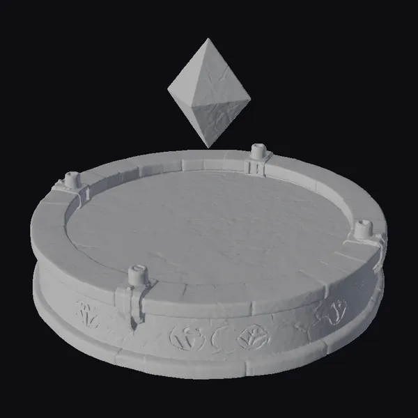 In a majestic pose, the mystic ritual circle presents itself with a stone platform encircled by a ring of fire, casting an otherworldly ambiance. The surface of the circle features a mesmerizing spiral pattern that draws the eye into its depths. Six candles, placed at equal intervals, cast a warm, golden light on the dark stone, while intricate red symbols etched into the sides of the platform pulse with a soft, ethereal glow. A pyramid, seemingly defying gravity, hovers above the center, adding an air of mystique. This 3D model is perfect for use in games, 3D printing, VR/AR experiences, animations, or designs that require a touch of the mystical and unknown.