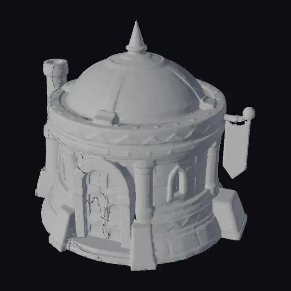 In a majestic pose, the Mystic Round Tower stands tall, its dome roof composed of meticulously arranged stone tiles, topped with a striking golden spire. The facade boasts a grand entrance with an arched doorway, flanked by two smaller windows, all accentuated with warm, earthy tones. A vibrant red banner, emblazoned with a golden emblem, flows gently in the breeze, adding a pop of color to the structure’s rustic charm. As the light dances across its surface, the tower’s textures and details come alive, inviting users to explore its mystical allure. Ideal for games, animation, or architectural design, this model brings a touch of ancient magic to any project.