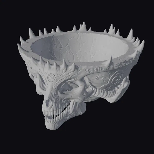 Perched on a base that resembles a snarling skull, this chalice boasts a bowl with a cracked, stone-like interior and a rim lined with menacing spikes. The exterior is a masterclass in dark fantasy design, with swirling symbols etched into its surface in a lighter, contrasting hue. The overall effect is one of macabre elegance, perfect for adding a touch of the mysterious and unknown to any setting. Whether you’re a game developer looking for a unique prop, a 3D artist seeking inspiration, or simply a fan of the dark and fantastical, this mystic skull chalice is sure to captivate.