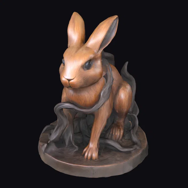 The Mystical Hare Entwined presents a captivating scene where a hare, rendered in warm light brown hues with meticulous attention to fur texture, sits alertly on a circular base. Its large, perked-up ears and detailed facial features convey a sense of calm vigilance. Dark, wavy vines entwine around its body, adding a mystical element to the sculpture. The contrast between the hare’s smooth fur and the intricate, flowing vines creates a visually appealing dynamic. This model is perfect for use in games, 3D printing, VR/AR experiences, animation projects, and design visualizations where a touch of fantasy and mystique is desired.
