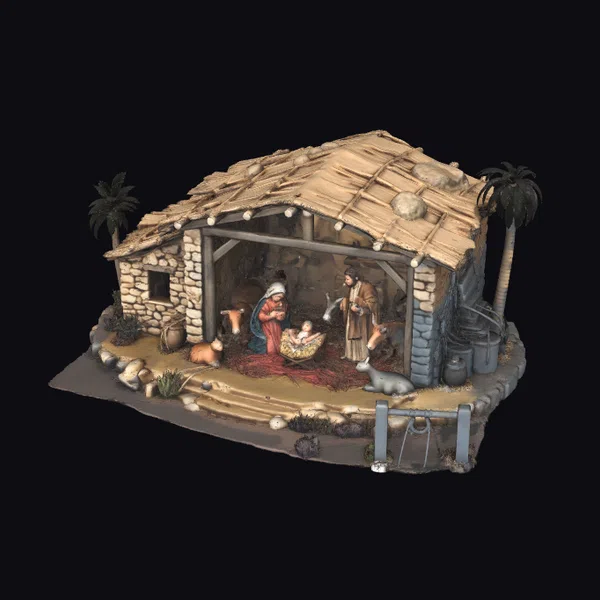 In a meticulously crafted diorama, a stone building with a thatched roof provides a humble backdrop for the holy family. The Virgin Mary sits beside a manger, cradling the baby Jesus, while Joseph stands watch, his hands holding a bundle. A donkey and a sheep graze nearby, adding to the peaceful ambiance. The scene is set against a simple, earth-toned landscape dotted with sparse vegetation and palm trees. This nativity scene is perfect for use in games, animations, or as a 3D model for architectural visualization, offering a richly detailed and emotionally resonant setting.