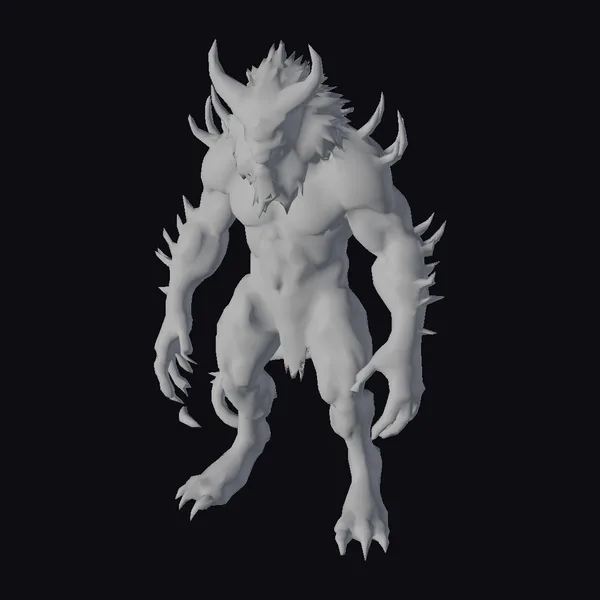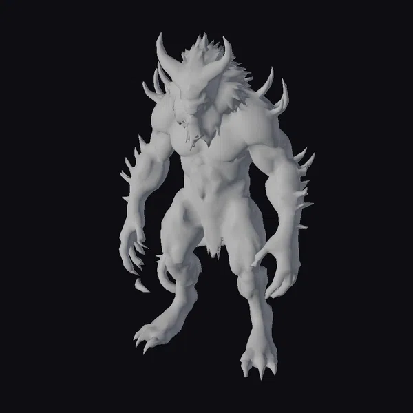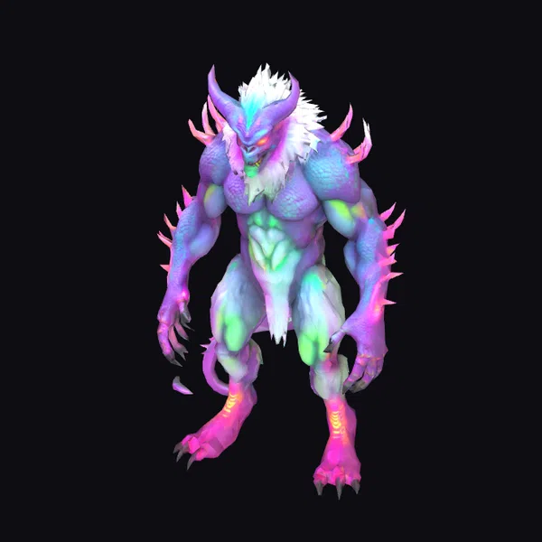 Standing tall with a muscular build, this creature showcases a mesmerizing blend of textures and colors. Its fur-like body is adorned with glowing neon accents, sharp spikes along its arms and back, and a fearsome dragon-like face. The creature’s pose exudes a sense of readiness, as if poised to strike at any moment. Its unique design makes it a compelling addition to any sci-fi or fantasy project, particularly in games, animation, or VR/AR experiences where a touch of the extraordinary is needed.