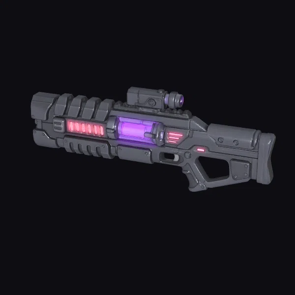 Detailed with precision, this futuristic blaster boasts a robust design, complete with a scope and ergonomic grip. The glowing purple cylinder and pink details pulse with an intense, neon light, suggesting advanced technology at work. Crafted with meticulous attention to detail, this model is perfect for game developers, animators, and designers seeking to infuse their projects with a touch of sci-fi flair. Its versatility makes it suitable for various applications, including game development, animation, virtual reality experiences, and architectural visualizations.
