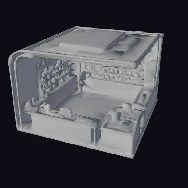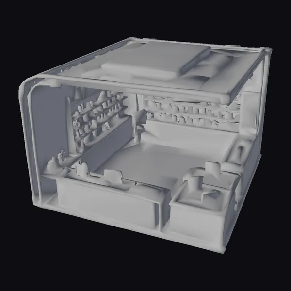 In a dynamic, isometric view, the neon cyberpunk asset shop unfolds with a rectangular open layout, showcasing a mesmerizing interior. The walls and floor are adorned with a rich, dark gray tone, while neon pink and blue accents dance across the surfaces, casting a futuristic glow. Holographic panels on the walls display an array of colorful, pixelated images, adding to the shop’s high-tech ambiance. The ceiling features a recessed, square panel with a pink and blue design, surrounded by a metallic border. The overall effect is one of sleek, cutting-edge style, perfect for projects requiring a cyberpunk aesthetic. Ideal for use in games, 3D printing, VR/AR experiences, animation, and design projects, this model brings a unique, futuristic environment to life.
