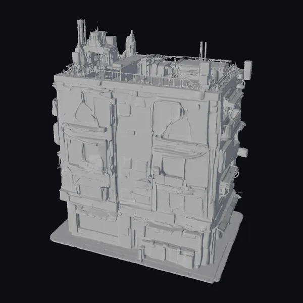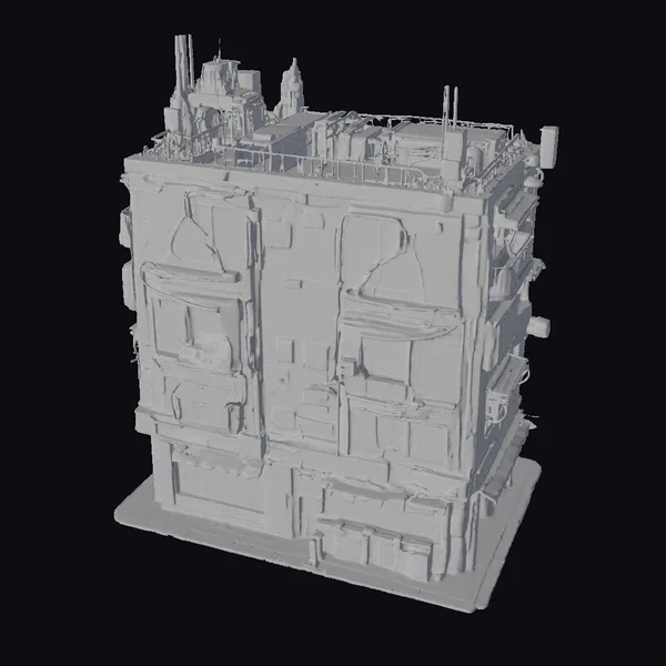Perched atop a sleek black base, this intricately detailed city tower model presents a dynamic, angular silhouette, its multiple levels and jutting architectural features evoking a sense of bustling metropolitan life. The exterior’s dark, weathered appearance provides the perfect canvas for the neon lights that adorn it, with purple outlines tracing the shapes of windows and structural elements, while warm yellow light spills from within, suggesting a hive of activity within. As the eye travels upward, it’s drawn to the rooftop’s complex arrangement of machinery, antennae, and other futuristic features, adding depth and complexity to the model’s design. This versatile model is perfect for projects requiring a touch of sci-fi flair, whether in game development, architectural visualization, VR/AR experiences, or animation.