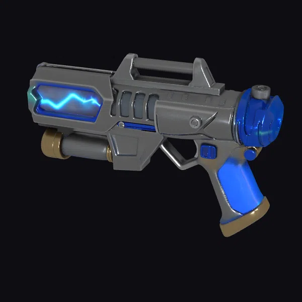 Floating dynamically in the spotlight, the Neon Plasma Blaster showcases its intricate design, from the glowing blue neon line tracing across its body to the metallic gray and blue hues that dominate its structure. The gold accents add a touch of luxury and advanced technology, suggesting a weapon of significant power and precision. The blaster’s design is meticulously detailed, with textures that suggest a durable, high-tech material. Its pose, angled as if ready for action, highlights its ergonomic grip and trigger mechanism, designed for ease of use in high-stakes situations. This model is perfect for projects requiring a futuristic firearm, suitable for games, 3D printing, VR/AR experiences, animation, and design projects, where a sleek, high-tech aesthetic is desired.
