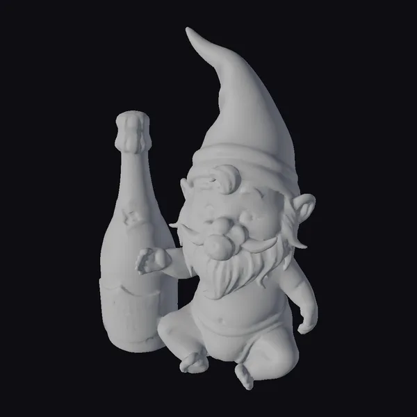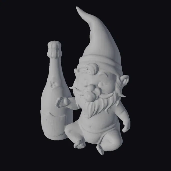 Detailed with a pacifier in his mouth and a champagne bottle by his side, this baby gnome is a delightful sight. The model showcases a plump, cheerful character with a prominent white beard and rosy cheeks, donning a bright red hat. The champagne bottle, labeled ‘HAPPY NEW YEAR’, adds to the celebratory atmosphere. The model’s pose and expression evoke a sense of innocence and joy, making it perfect for various creative projects. Its cartoonish style ensures it can be used in a variety of contexts, from animations and games to print and VR/AR applications.