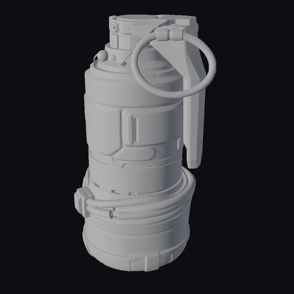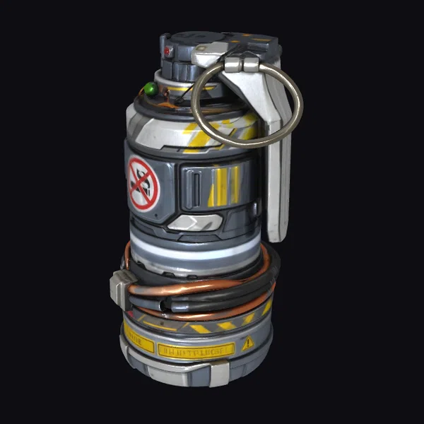 Detailed with precision, this smoke bomb model showcases a complex arrangement of industrial elements. The body is primarily dark grey with metallic silver accents and yellow warning stripes. A prominent red and white no-smoking sign is emblazoned on the side, adding a pop of color. Wrapped in black and copper wires, the bomb’s design suggests advanced technology. The metal pull ring, attached to a short lever, appears ready to deploy. This model excels in 3D rendering, animation, and game design, offering a realistic and detailed prop for various projects.