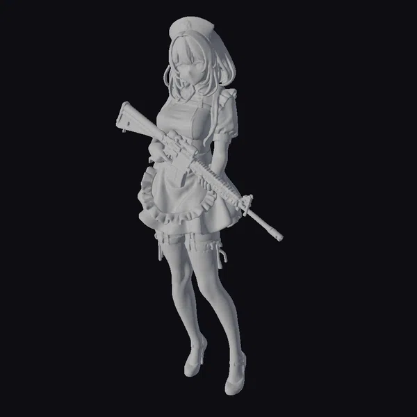 Detailed with precision, this model showcases a nurse in a dynamic pose, her pink hair styled in a fashionable bob, adorned with a white nurse’s cap featuring a bright red cross. Her short white dress and thigh-high socks are a stark contrast to the large black assault rifle she confidently holds. The blue eyes add a pop of color and a hint of sassiness to her overall appearance. The stylized features and vibrant colors make this model perfect for projects requiring a unique blend of cuteness and edginess, such as animations, games, or virtual reality experiences.