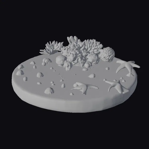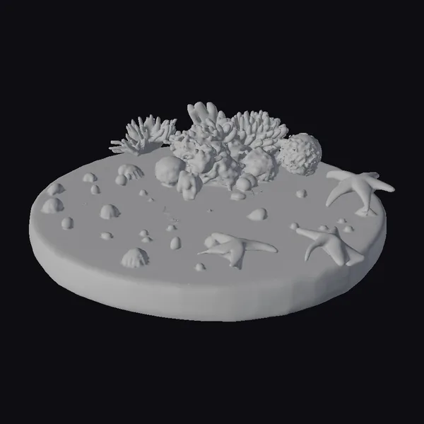 Gaze upon the mesmerizing details of this ocean base, where a turquoise circular platform is meticulously covered with a variety of coral, ranging from fiery red to soft pink and beige. The base is scattered with an assortment of shells and small white pebbles, adding texture and depth to the scene. Three bright orange starfish are positioned across the base, their arms outstretched as if caught in a moment of gentle movement. The coral and shells are intricately textured, with the coral displaying a range of colors from deep red to pale pink and beige. The base itself has a smooth, slightly marbled appearance, suggesting the subtle play of light on water. This model is ideal for use in games, 3D printing, VR/AR experiences, animation, and design projects, offering a richly detailed and immersive oceanic environment.