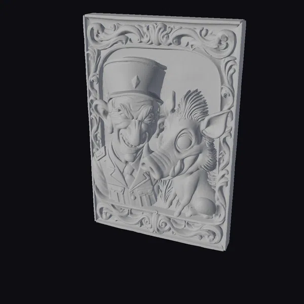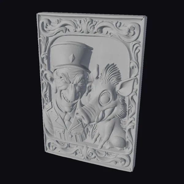 This eye-catching portrait showcases a peculiar pair: a smiling officer with an elongated face, donning a military hat and uniform, stands alongside a warthog with a similarly playful demeanor. The duo is encased in an intricately designed frame, complete with swirling patterns and a sense of depth. The textures are smooth and cartoonish, with bold lines and bright colors that leap out of the frame. The officer’s uniform is a warm beige, while the warthog’s bristly fur and sharp tusks add a touch of realism to the otherwise fantastical scene. This model would be perfect for animation, games, or design projects seeking a lighthearted, comedic element.