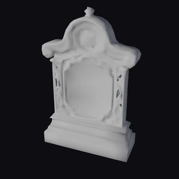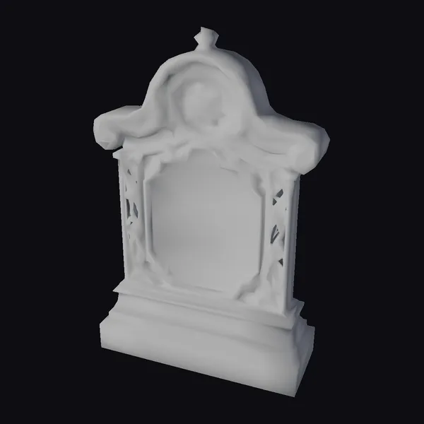 Perched atop a rectangular base, this hyper-realistic gravestone model features a domed top adorned with a delicate wheel design and flanked by scroll-like protrusions. The central panel, blank and worn, seems to whisper secrets of the past. Moss and lichen cling to the stone, while fallen leaves scatter the base, creating a sense of abandonment and neglect. The model’s intricate textures and details make it an ideal choice for games, animations, or architectural visualizations seeking to evoke a haunting atmosphere. Its realistic appearance and Gothic style ensure a seamless integration into various projects, from horror-themed environments to historical settings.