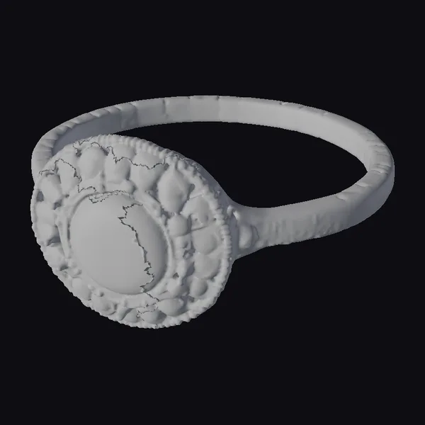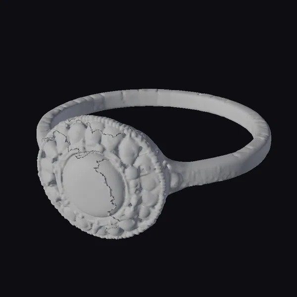 This stunning opal ring boasts a large, oval-shaped opal stone at its center, radiating a kaleidoscope of colors that seem to shift and change as the light catches it. The opal is encircled by a delicate pattern of small gold dots, which in turn is surrounded by a series of circular cutouts in the dark, oxidized metal. The band of the ring is thick and sturdy, with a subtle texture that catches the light. The level of detail in this model is exceptional, from the intricate texture of the opal to the delicate gold accents. This model would be perfect for use in jewelry design, fashion accessories, or even as a standalone decorative piece. Its realistic style and attention to detail make it an excellent choice for high-end applications.