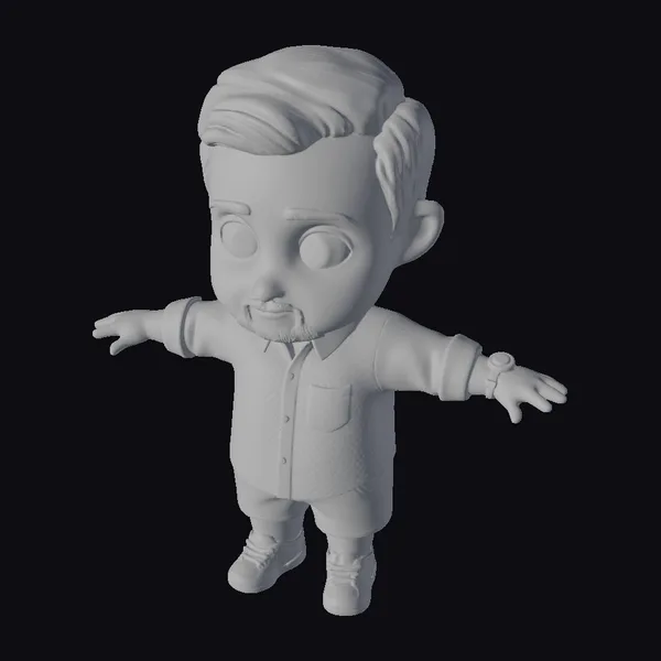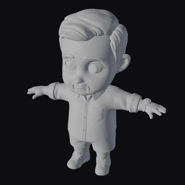 Detailed with precision, this cartoon character model showcases a man in a welcoming stance, arms wide open. His green shirt is buttoned up with a pocket on the chest, paired with black shorts and crisp white sneakers. A sleek watch adorns his wrist, and his brown hair is styled neatly. The character’s facial features are defined by expressive brown eyes and a subtle facial hair. The model is highly versatile, suitable for various applications such as animation, game development, virtual reality experiences, and 3D printing. Its cartoon style makes it an excellent choice for projects requiring a friendly, approachable character.