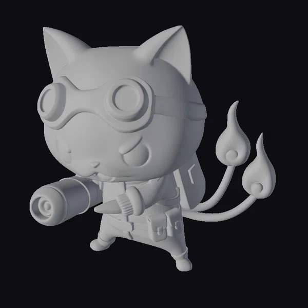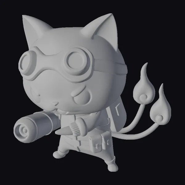 Detailed with precision, the catbot’s orange fur gradates with white markings on its face, complemented by yellow eyes and pink inner ears. Its goggles feature glowing blue lenses, while a flamethrower on its back emits two glowing blue flames. A tool belt with pouches and a backpack add to its utility. Ideal for projects requiring a playful yet adventurous character, such as animations, games, or sci-fi designs.