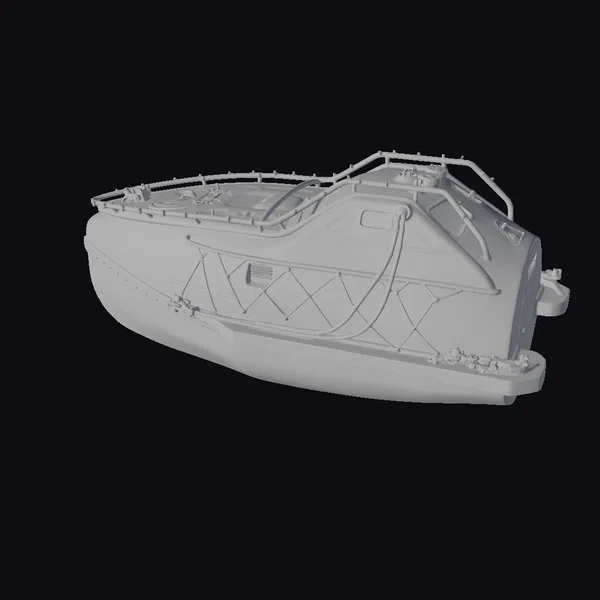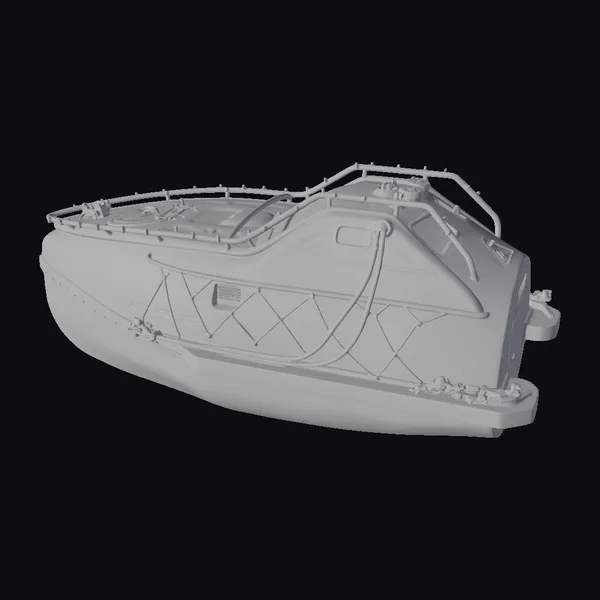 Positioned dynamically on a black background, the lifeboat’s detailed features are accentuated. The bright orange hull is complemented by a black frame and ropes, providing a striking contrast. The boat’s design includes a compact cabin and a sturdy exterior framework, emphasizing its durability and functionality. The lifeboat’s proportions are accurate, with precise details such as secure ropes and a streamlined body. This model is perfect for use in maritime safety simulations, emergency response training, or as a prop in film and animation projects. Its realistic appearance and attention to detail make it an excellent choice for any project requiring a lifelike lifeboat.
