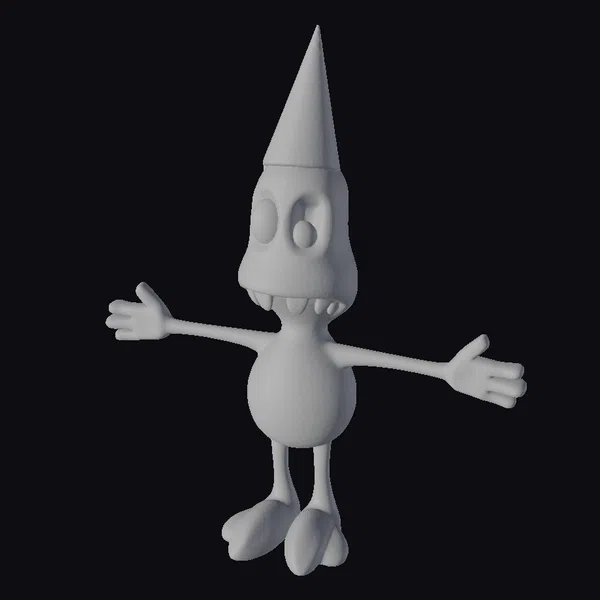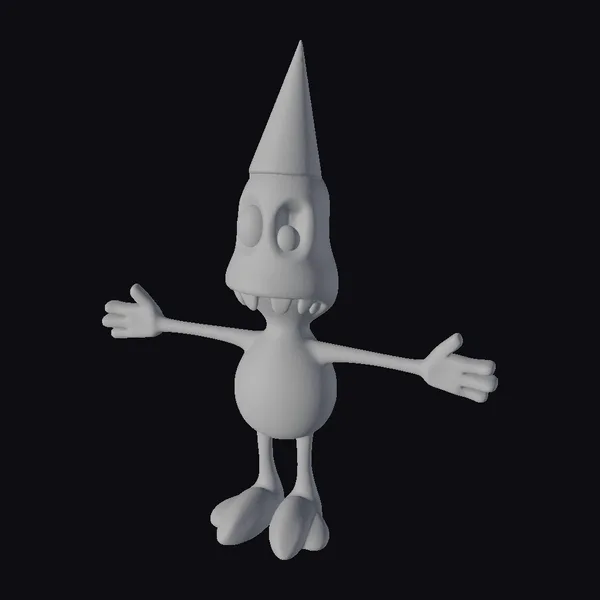 Detailed with precision, this cartoonish monster boasts a bulbous orange body, long arms, and stumpy legs, all topped with a pointed party hat. The model’s textures are smooth and inviting, with a subtle sheen that catches the light. The eyes are wide and expressive, adding to the character’s playful demeanor. The pose, with arms outstretched and a welcoming stance, makes this monster perfect for use in animations, games, or as a decorative element in designs. Its whimsical nature makes it an excellent fit for projects aimed at a younger audience or for adding a touch of lightheartedness to any scene.
