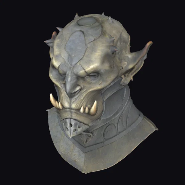 This meticulously crafted orc warrior bust presents a formidable visage, its head and neck emerging from a base that resembles a segmented armor collar. The orc’s skin is a complex gray and metallic texture, punctuated by sharp, pointed spikes that add to its intimidating appearance. Its facial features are deeply chiseled, with prominent cheekbones, a sharp jawline, and a nose that is slightly flattened. The eyes are narrowed, giving the orc a constantly alert and aggressive look. Two large, sharp teeth protrude from its mouth, suggesting a readiness to strike at any moment. The armor around its neck is adorned with circular patterns and ridges, adding to the overall sense of a creature prepared for battle. This model is perfect for use in games, 3D printing, VR/AR experiences, animation, and design projects where a touch of fantasy and menace is required.