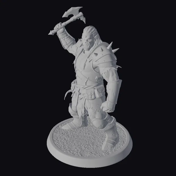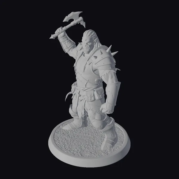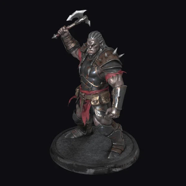 Standing tall on a rugged base, the orc warrior is captured in a dynamic pose, his right arm raised high as he grasps the handle of his imposing battle axe. The armor that covers his body is a mix of dark metals, adorned with spikes and red accents that suggest a history of bloody battles. The texture of the armor, the roughness of the base, and the detailed musculature of the orc himself all contribute to a highly realistic and immersive visual experience. This model is perfect for use in games, 3D printing, VR/AR experiences, animation projects, and design visualizations where a formidable, fantasy creature is needed.