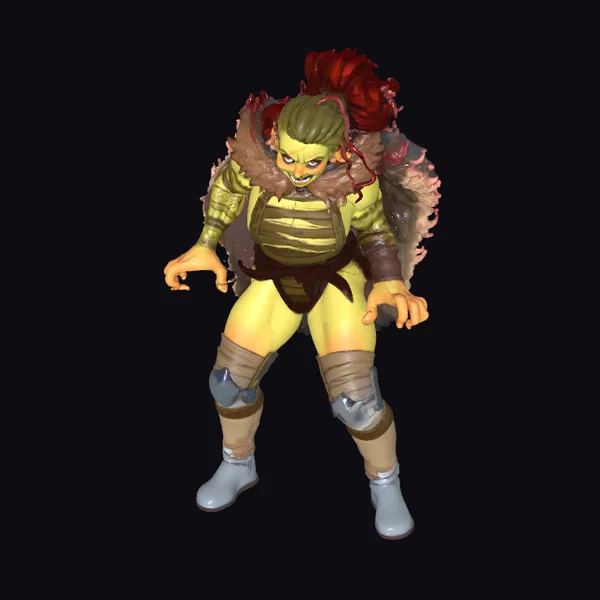 Positioned in a powerful stance, this orc warrior exudes an aura of raw strength and fury. The model’s green skin tone is complemented by a detailed fur cape draped over its shoulders, with visible textures that suggest a wild, untamed essence. The warrior’s armor, a mix of earthy tones, adds to its rugged appearance, while the intense facial expression and sharp teeth convey a sense of readiness for combat. The model’s pose, with hands slightly bent and legs spread wide, emphasizes its muscular build. Ideal for use in fantasy settings, games, animations, or as a detailed addition to 3D scenes, this orc warrior model brings a touch of mythical intensity to any project.