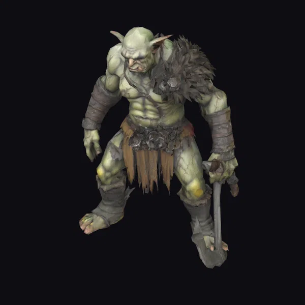 Standing imposingly, this orc warrior model showcases intricate details such as muscular definition under its green skin, tattered and brown clothing, and a menacing snarl on its face. The rusty sword in its hand appears ready for battle, while the pointed ears and sickly pale grey-green skin emphasize its otherworldly nature. Crafted with a focus on dark fantasy elements, this model is perfect for projects requiring a gritty, mythical creature. Its pose suggests movement and aggression, making it suitable for animations, games, and virtual reality experiences where a fearsome orc presence is needed.