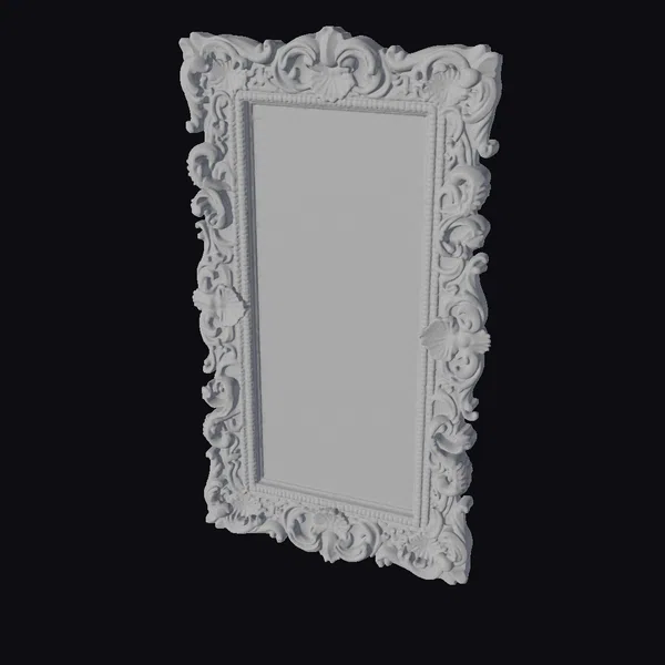Crafted with meticulous attention to detail, this ornate black baroque mirror frame boasts an elaborate design that exudes luxury and sophistication. The frame’s intricate carvings feature a mix of acanthus leaves and dragon motifs, adding a touch of gothic elegance. The dark matte finish gives the mirror a sense of depth and subtlety, while its vertical rectangular shape makes it a versatile piece for any room. Whether used in games, print, VR/AR, animation, or design, this mirror is sure to add a touch of drama and refinement. Its empty mirror surface invites reflection, making it a perfect addition to any creative project.