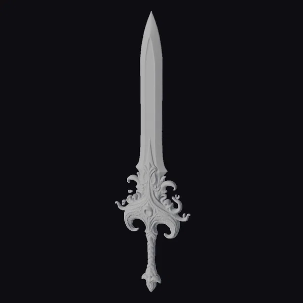 In a majestic pose, this ornate fantasy sword stands tall, its slender blade tapering to a sharp point. The hilt is a masterwork of abstract design, with swirling patterns that evoke a sense of dynamic movement. Turquoise accents burst with vibrant color, adding an otherworldly sheen to the metallic surface. As light catches the blade, its curves and contours seem to shift and shimmer. Ideal for games, animation, or 3D printing, this sword model promises to bring a touch of magic to any project. Its intricate details and bold design make it perfect for fantasy worlds, anime-inspired stories, or sci-fi adventures.