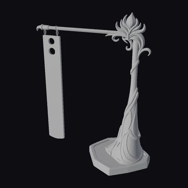 Positioned at a slight angle, the sign stand’s base showcases a beautifully textured white marble effect, complete with subtle green accents that seem to shimmer in the light. The stand’s slender, curved body is wrapped in intricate gold and green detailing, culminating in a stunning blue gemstone at its apex. A long, thin metal bar extends from the top of the stand, supporting a vibrant orange sign with two circular cutouts. The entire piece exudes a sense of luxury and mystique, perfect for adding a touch of fantasy to any setting. Ideal for use in games, 3D printing, VR/AR experiences, animation projects, or architectural design.