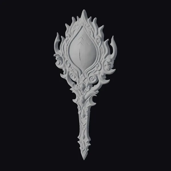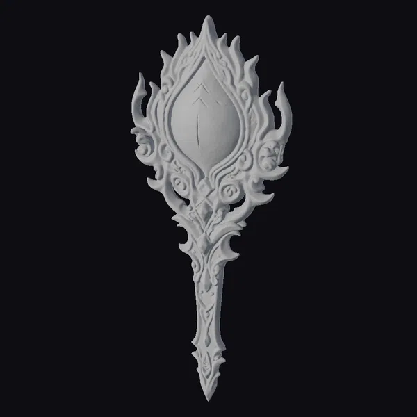 This exquisitely detailed wand boasts a teardrop-shaped teal gemstone at its center, surrounded by delicate, flame-like metalwork that appears to dance across its surface. Two smaller gemstones accentuate the wand’s handle, which tapers to a sharp, pointed tip. The metallic surface exhibits a dark, weathered patina, suggesting a rich history of use. As a 3D model, this wand is perfect for use in fantasy games, animations, or 3D printing projects. Its intricate design and magical aura make it an ideal prop for bringing fantastical worlds to life.
