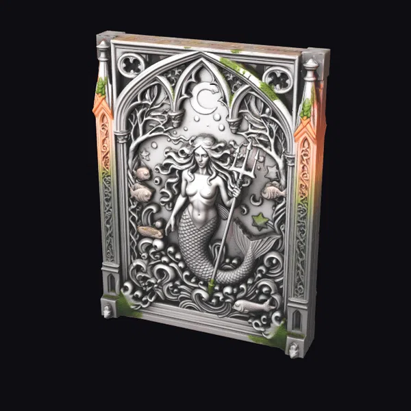 Gaze upon the majestic mermaid, her tail elegantly curled around a trident, as she stands proudly at the center of this ornate book cover. The gothic-inspired frame, adorned with seaweed and shells, transports you to an underwater world where mythology and magic reign. The cover’s silver hue, complemented by touches of green and orange, adds a layer of mystique. Perfect for fans of fantasy literature, this 3D model is ideal for enhancing games, animations, or virtual reality experiences with its rich details and immersive design.