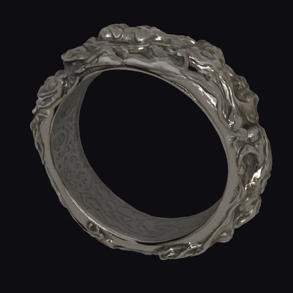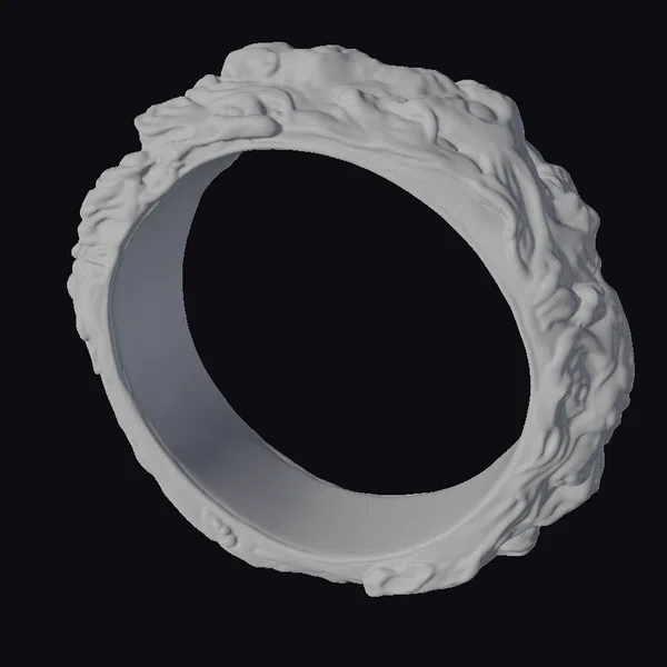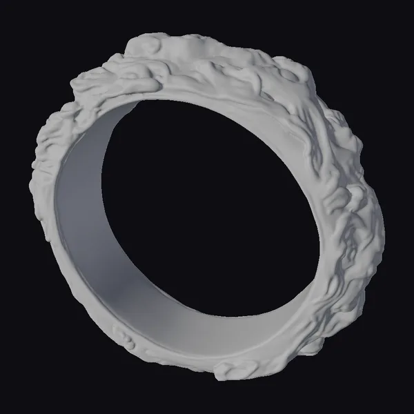Positioned dynamically to showcase its full, rounded shape, this ornate metal bangle features a highly detailed exterior with a wavy, organic design that gives it a unique, eye-catching appearance. The gray, shiny surface reflects light, highlighting the intricate textures and patterns that cover the bangle. Its interior is not left plain; instead, it sports an etched design that mirrors the complexity of the exterior, ensuring that every angle of this piece is a feast for the eyes. Ideal for use in games, 3D printing, VR/AR experiences, animation, and design projects, this model brings a touch of elegance and realism. Whether you’re aiming to create a character with a flair for the dramatic or simply looking to add a sophisticated element to your project, this bangle fits the bill.