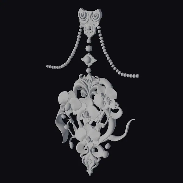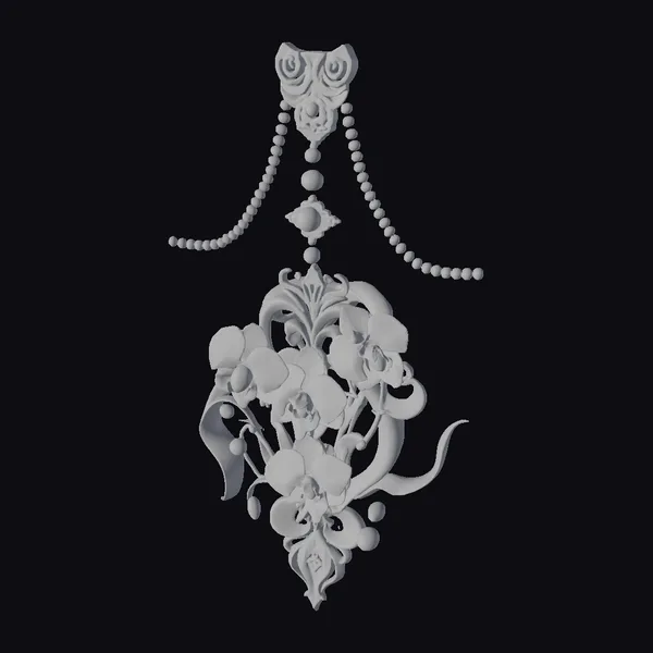 This exquisite piece of jewelry features a black filigree pendant adorned with a lush arrangement of pale purple orchids. The pendant is suspended from a chain of small, round beads that add a touch of elegance to the overall design. The filigree work is intricate, with swirling patterns that frame the flowers beautifully. The orchids themselves are detailed with delicate petals and subtle shading, giving them a lifelike appearance. The chain is long enough to allow the pendant to rest below the collarbone, making it a statement piece. The combination of the dark, ornate metalwork and the soft, pastel hues of the orchids creates a striking contrast that draws the eye. This model is perfect for use in games, 3D printing, VR/AR experiences, animation, and design projects where a touch of elegance and mystery is desired.