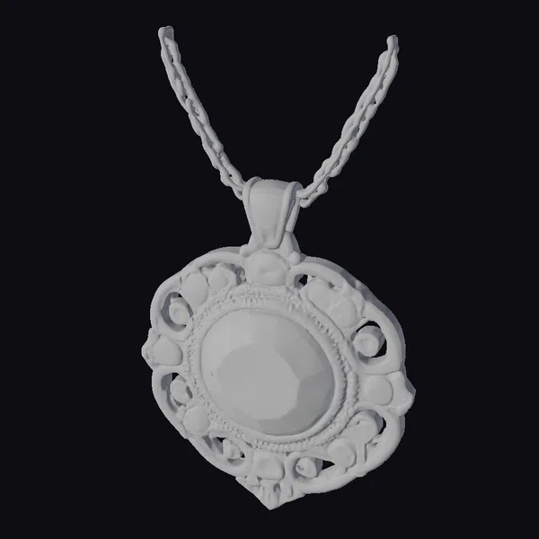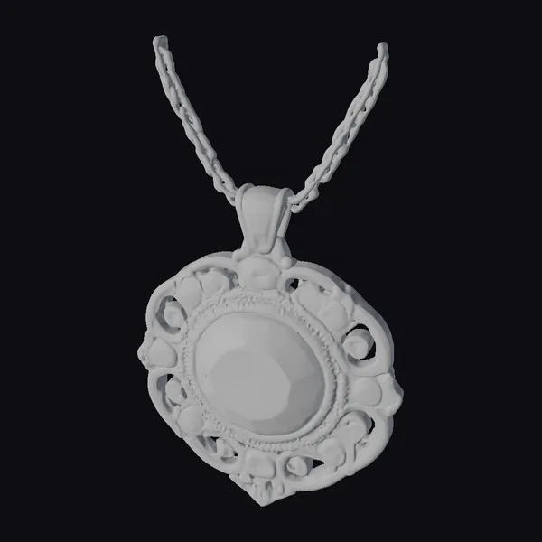 This stunning piece of jewelry features a large, oval-cut purple gemstone as its centerpiece, surrounded by a delicate pattern of silver filigree and a series of smaller, round blue gemstones. The pendant’s intricate design and the way light catches the facets of the gemstones create a mesmerizing effect. The silver chain, adorned with a small, teardrop-shaped connector, adds a touch of elegance to the overall piece. Ideal for use in games, 3D printing, VR/AR experiences, animation, and design projects, this model offers a high level of detail and realism. The ornate pendant and chain are meticulously crafted, making this a valuable addition to any project requiring high-quality, realistic jewelry.